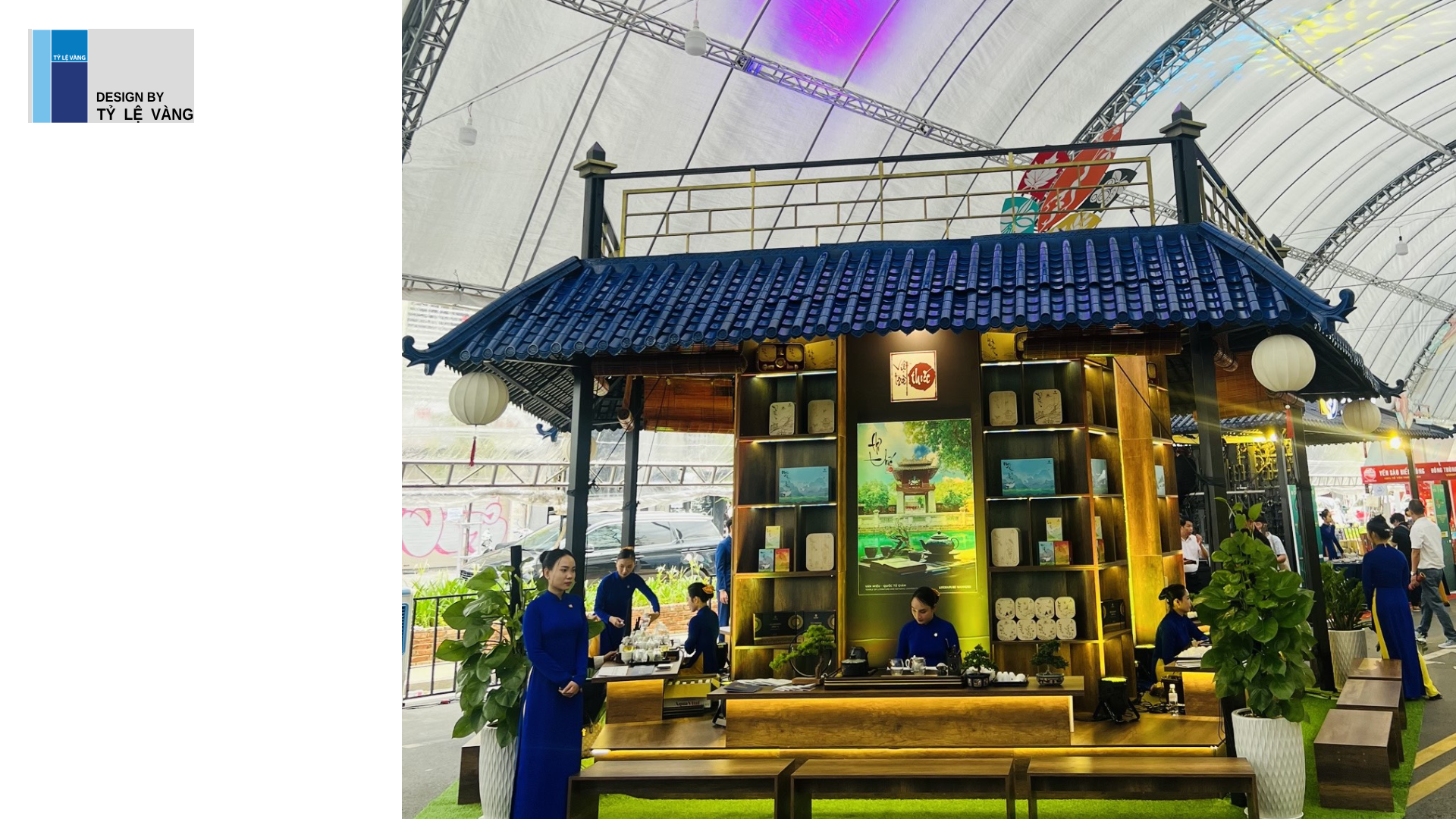 Chúng tôi TLV đã tận dụng không gian với diện tích nhỏ của triển lãm kết hợp với việc bố trí nội thất để tạo nên không gian hài hòa và tinh tế nhưng vẫn đảm bảo tính công năng và tiện lợi vận hành trong lúc Lễ hội diễn ra. Chúng tôi chọn màu gỗ tương ứng với tone trầm ấm để phục vụ Quý khách. Tỉ Lệ Vàng đã triển khai thiết kế và thi công 2 gian hàng dùng cho phục vụ sự kiện gồm: 1 gian hàng sản phẩm Trà kết hợp với Sâm Ngọc Linh và gian hàng còn lại phục vụ các dòng sản phẩm Việt Trà Thức.